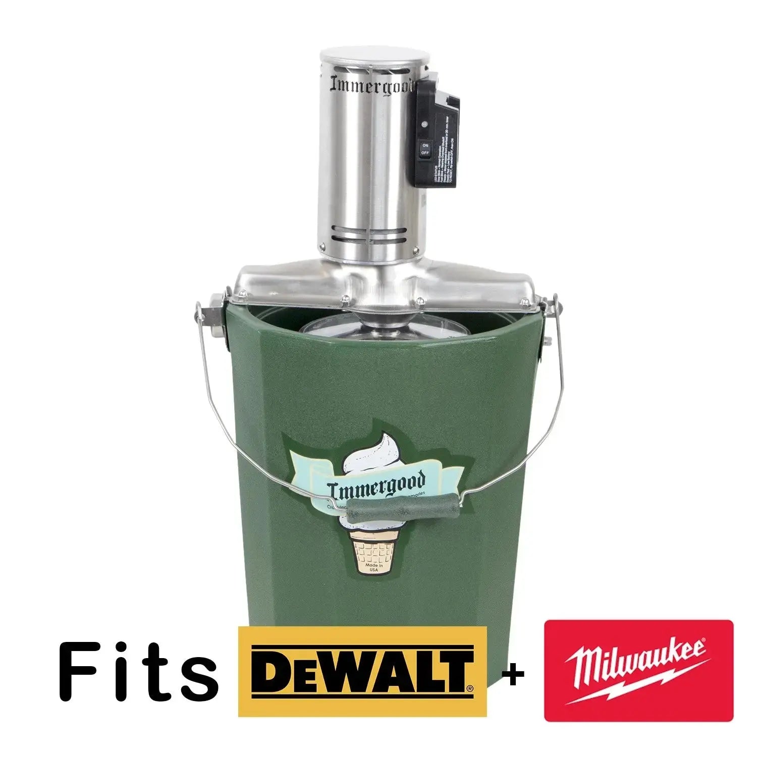 - IMMERGOOD MOTOR, 18/20 volt Milwaukee, DeWalt, Makita battery, built from the ground up to be strong yet full of features. Motor has an On/Off Switch with circuit board controls to protect your battery.